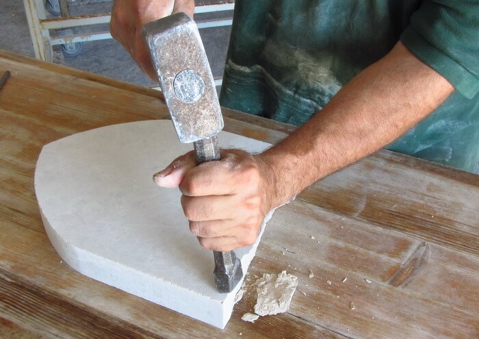 Nella lavorazione tradizionale artigianale della pietra vengono usati antichi utensili a percussione. Servono per spaccare, ricavare blocchi, sbozzare, sgrossare e modellare la materia tramite una serie di colpi.
